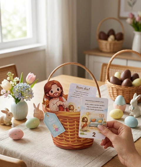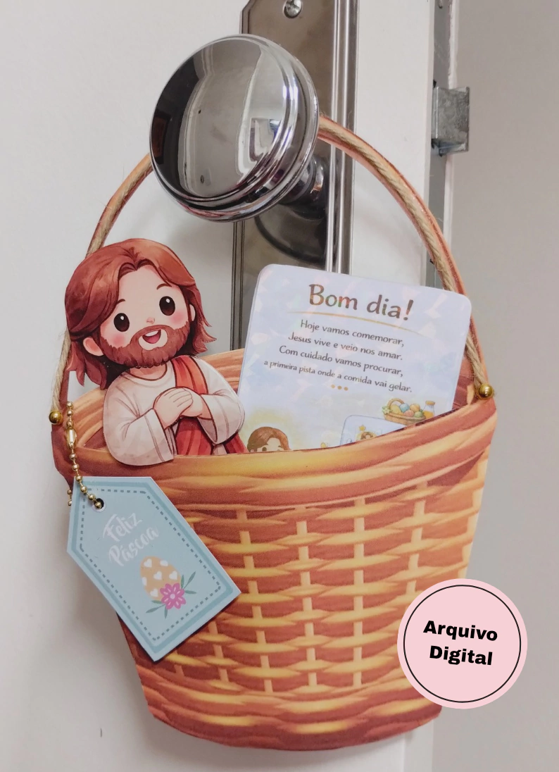 Molde de cestinha de Páscoa, com Jesus e tag para montar