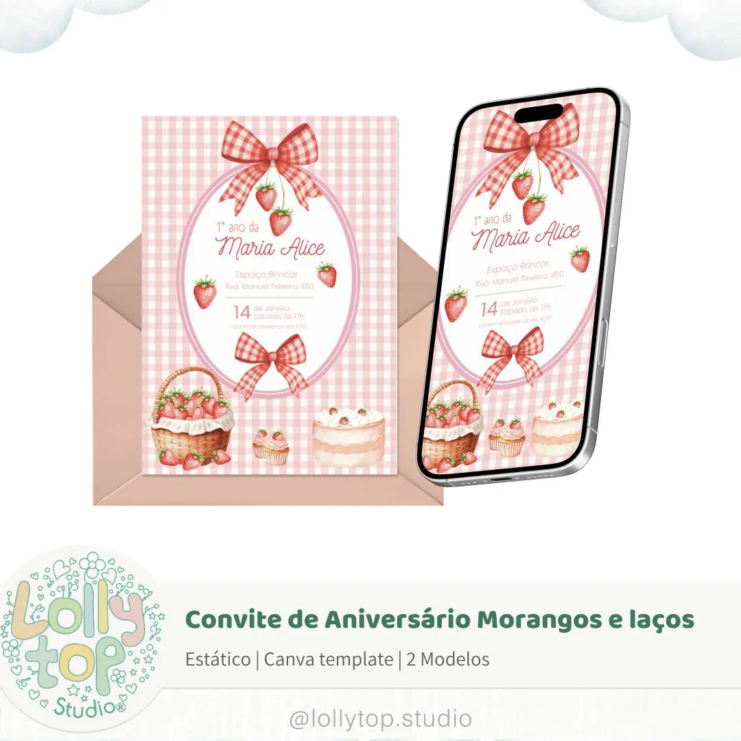 Convite de Aniversário – Morangos e Laços- LINK CANVA