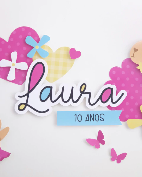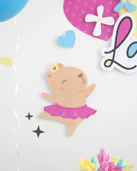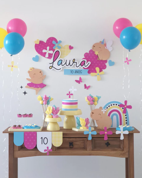Painel: Capivaras, corações, borboletas, flores, nome e faixa ;