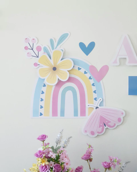 Painel: Arco íris, flores, faixa , borboletas e corações;