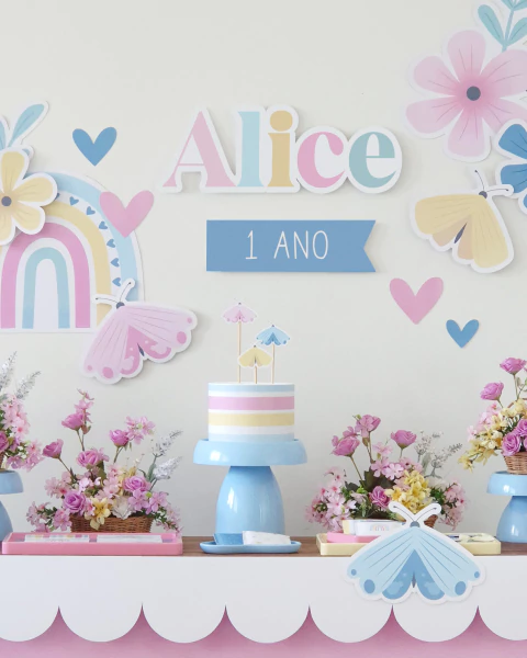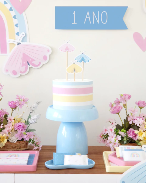 Frente mesa: Bandeirolas, borboleta e faixa listrada.