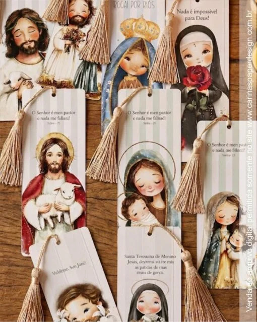 Em formato13,2x 5,5 cm (8 por folha A4), práticos e econômicos de produzir, esses marcadores trazem ilustrações fofinhas e devocionais de de Maria, Jesus e outros santos. Ideais para catequese, eventos na igreja, dar como lembrancinha, usar como marcador da sua leitura Bíblica.