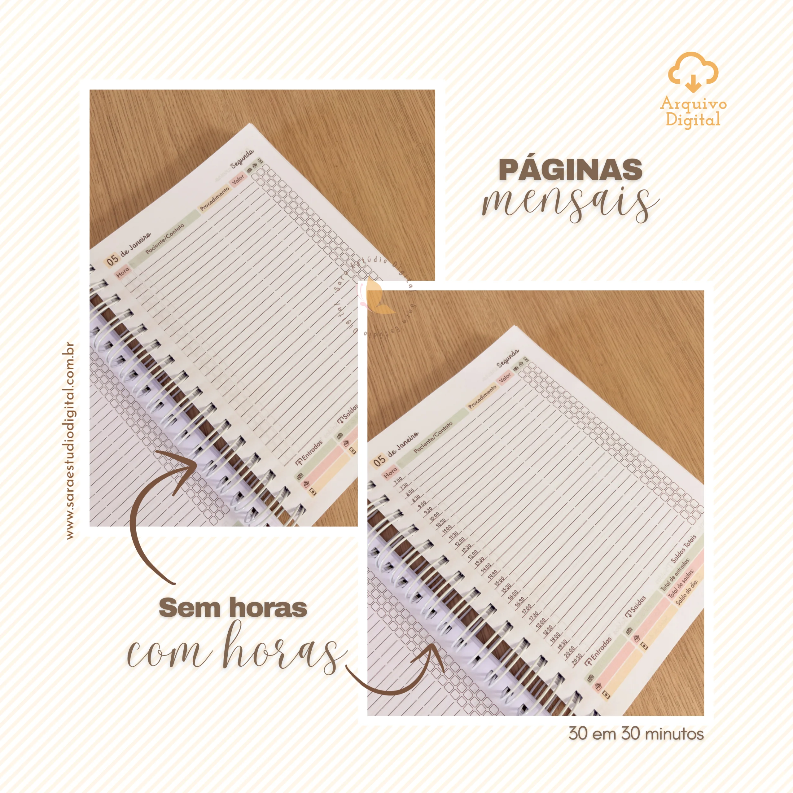 Conteúdo: dados pessoais, calendários de 2026 e 2027, datas importantes, divisórias inclusas no miolo com planejamento mensal no verso, controle financeiro ao final de cada mês, logins e senhas, e contatos.