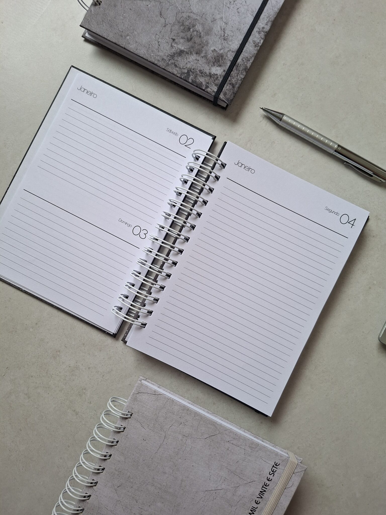 – Agenda 1 dia por página (sáb/dom na mesma página) com horário das 7 às 20h (segunda a sexta) e horário das 8às 18h (sáb. e dom) – 350 páginas