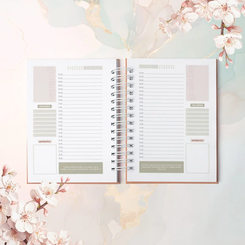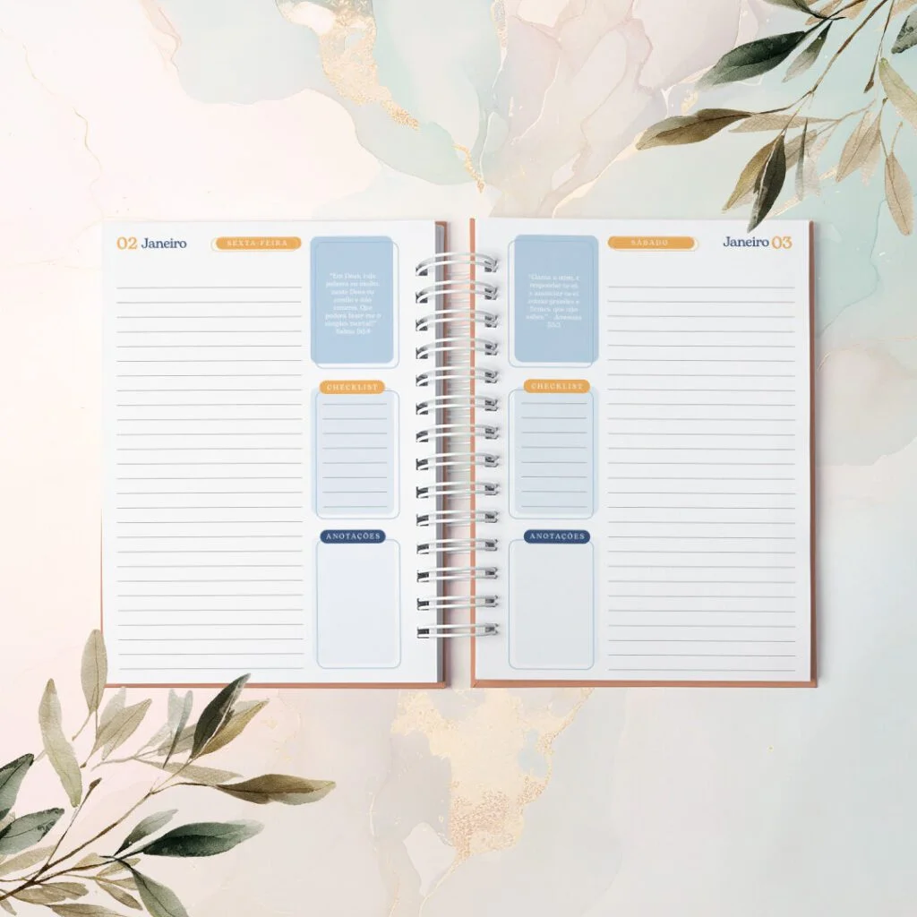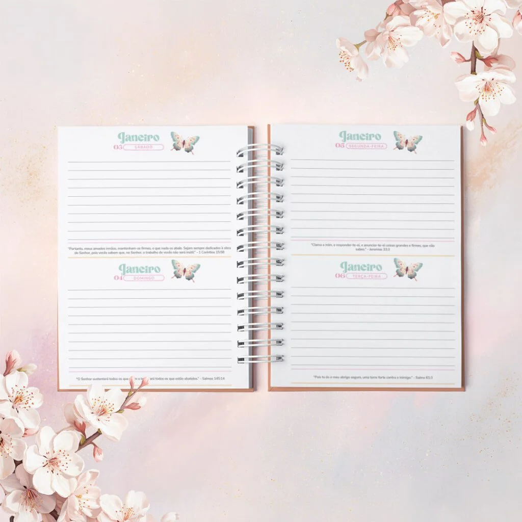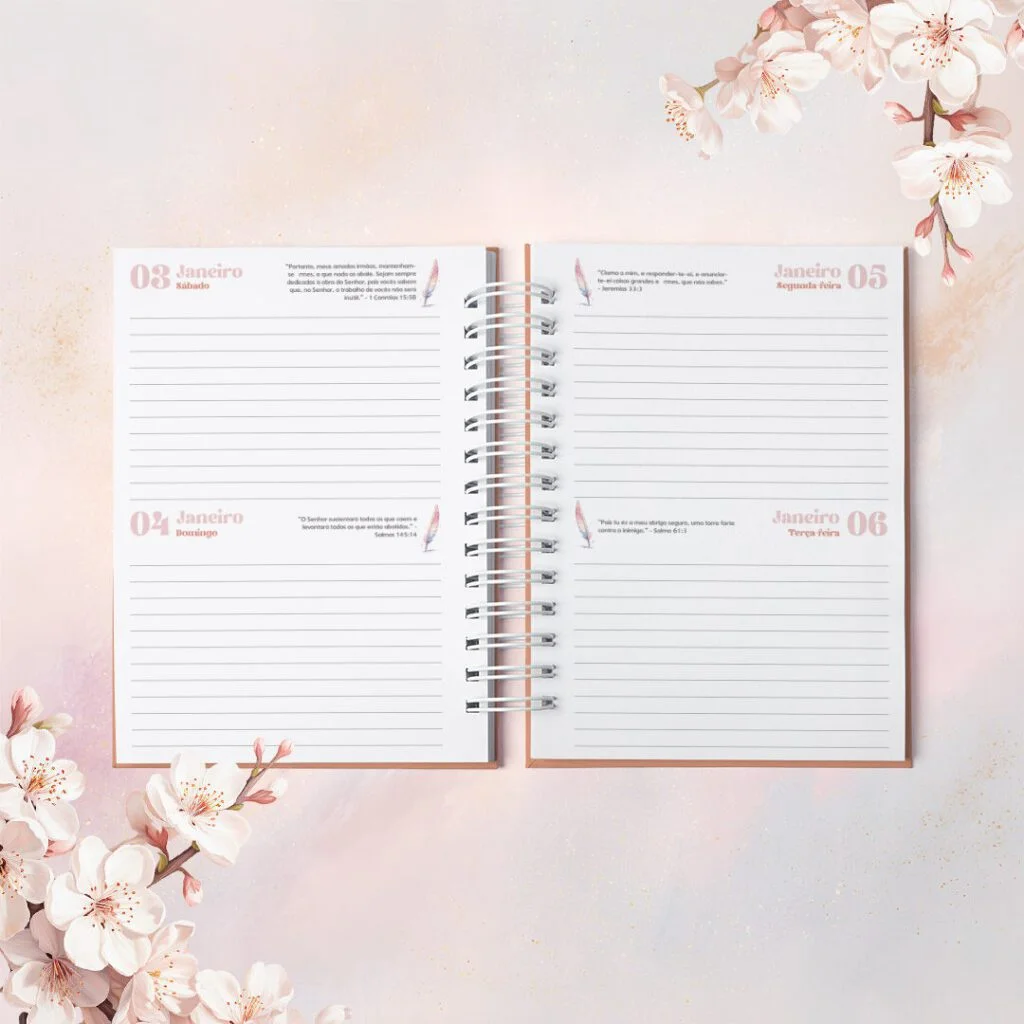 Combo Agendas com Versículos Permanentes e Datadas foi criado para quem vê a organização como algo além de prazos e listas. Com um versículo bíblico diferente em cada página, elas irão acompanhar o dia com leveza, como presença diária de inspiração e fé no meio da rotina.