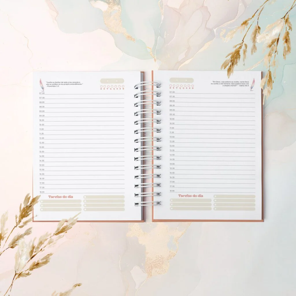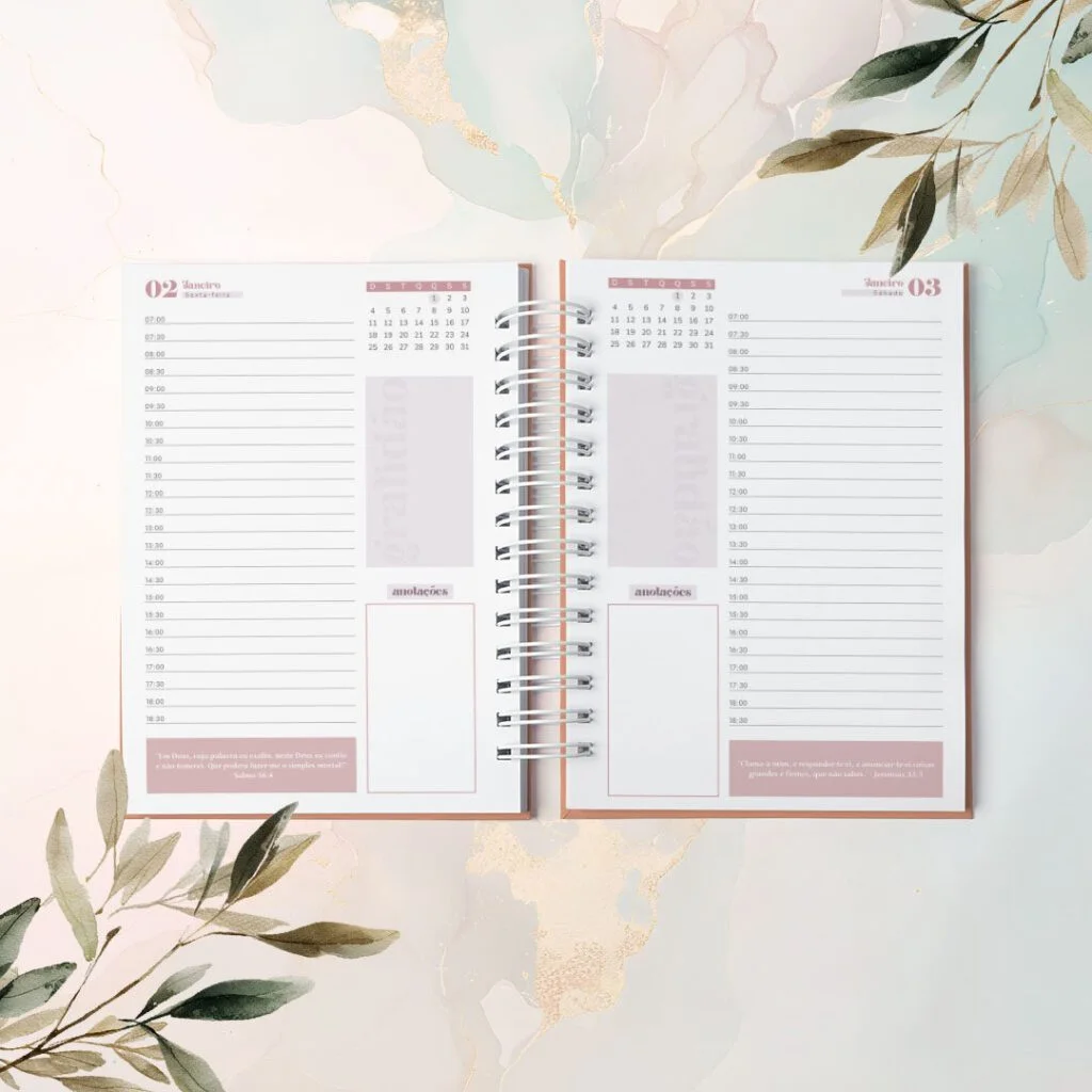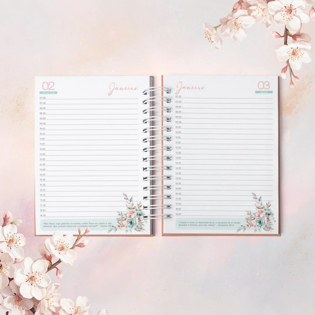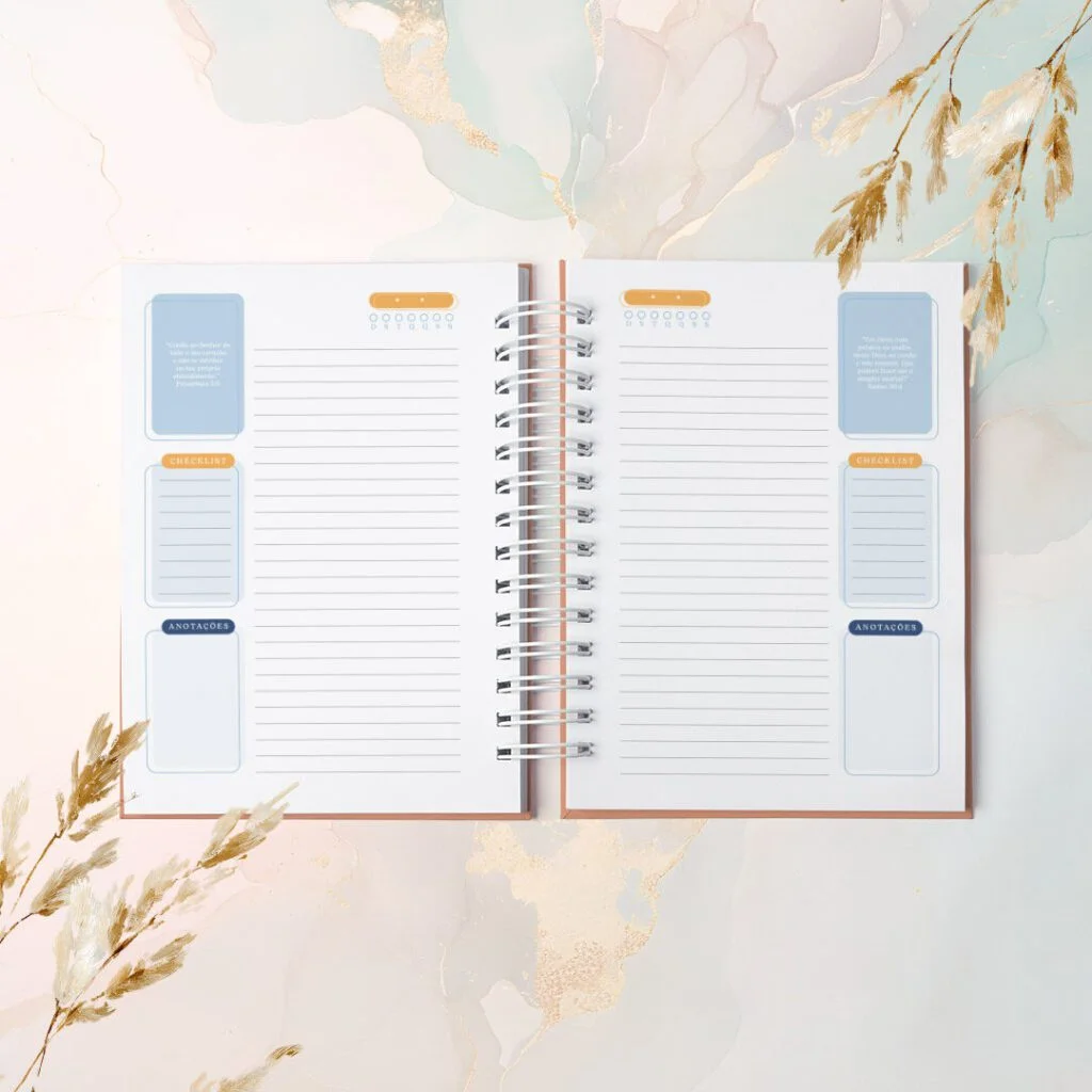 Combo Agendas com Versículos Permanentes e Datadas foi criado para quem vê a organização como algo além de prazos e listas. Com um versículo bíblico diferente em cada página, elas irão acompanhar o dia com leveza, como presença diária de inspiração e fé no meio da rotina.