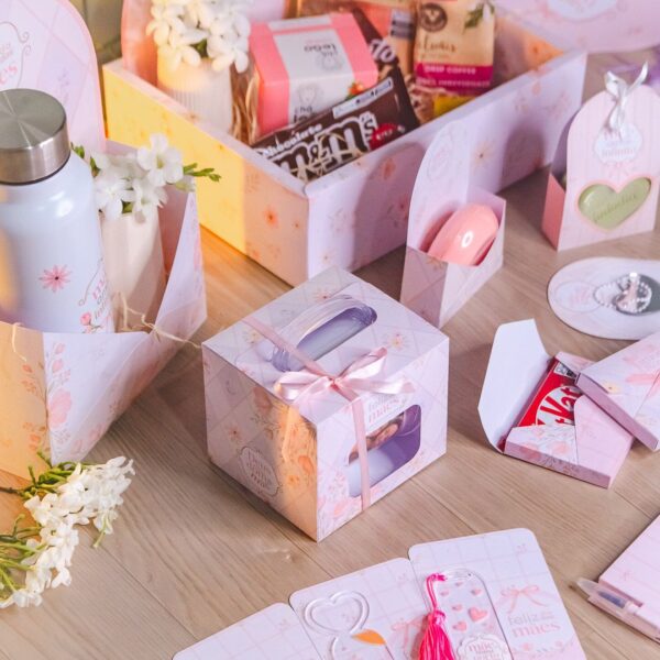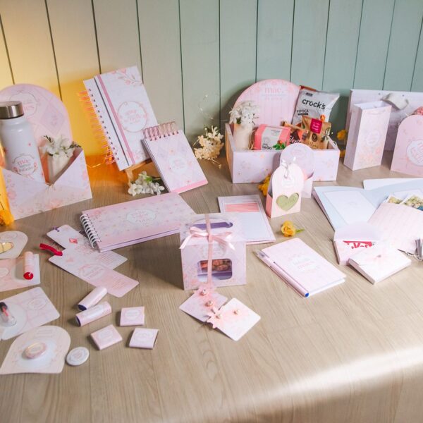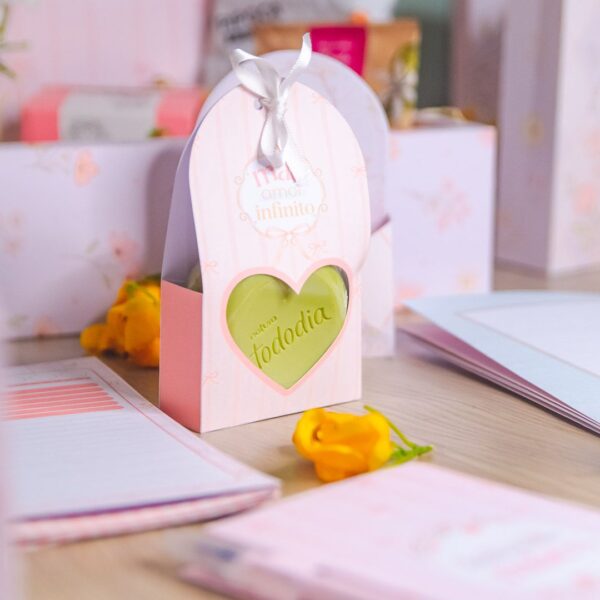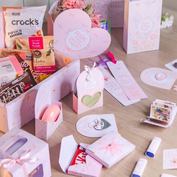 Adesivo tag botton, balinha e batom, bis, bloquinho A7 com capa e caneta, caixa caneca econômica, caixa coração grande, caixinha envelope KitKat, caixinha envelope pequena, caixa envelope grande, canecas, card para marca-página acrílico, card versátil, cesta, KitKat, marca-página, mini álbum chaveiro, rótulo La Creme, sacola média, sacola mini, sacolinha sabonete e tag brinco.