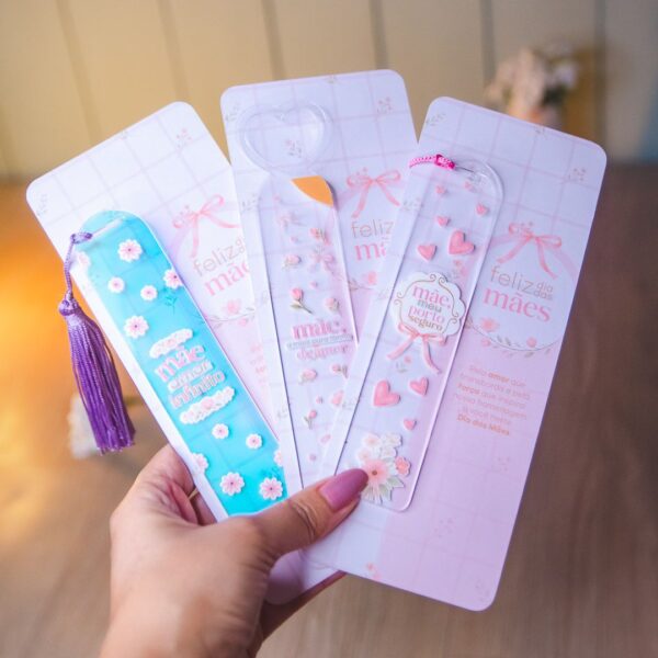 3 modelos de canecas · 2 modelos de cartelas · 3 modelos de marca-página acrílico