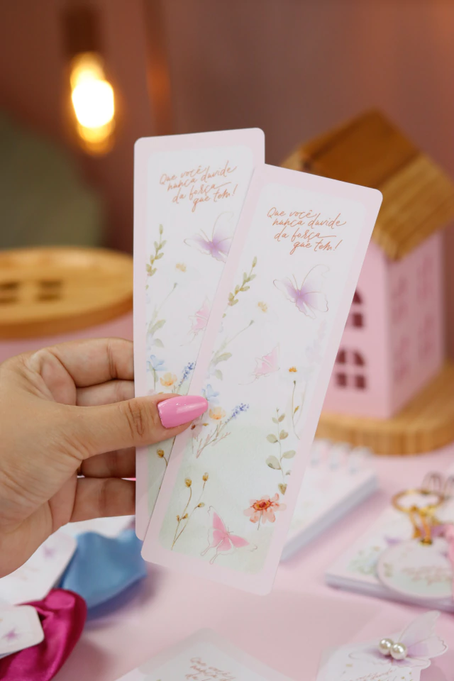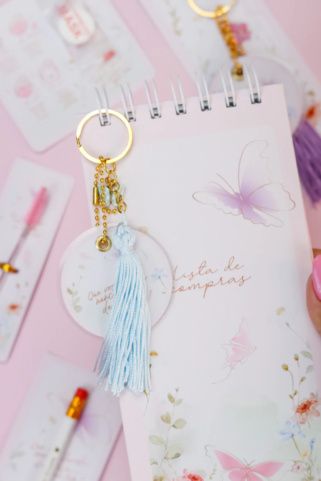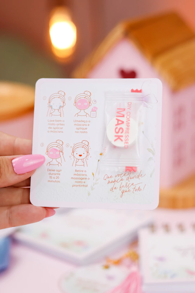 - máscara do rosto, cílios, xuxinha, serrinha, brincos, lápis ou caneta, tag redonda para chaveirinho e marcadores de página.