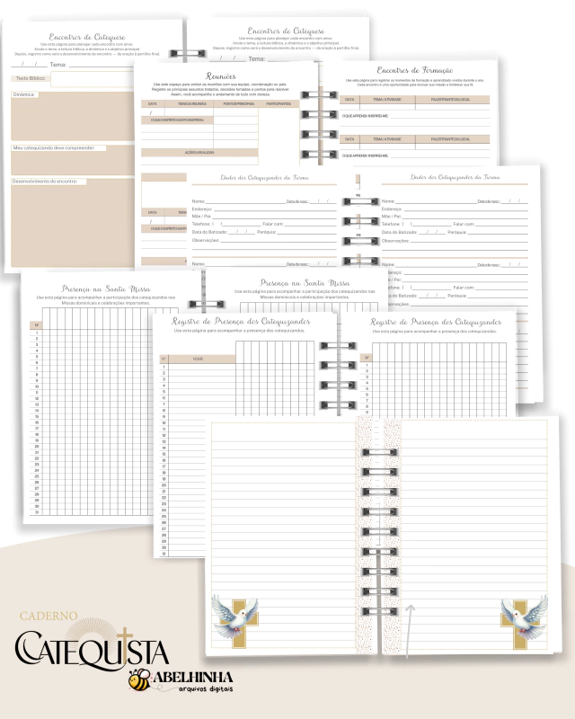 Páginas de organização — cronograma da catequese, reuniões, formações, planejamentos e anotações inspiradoras.