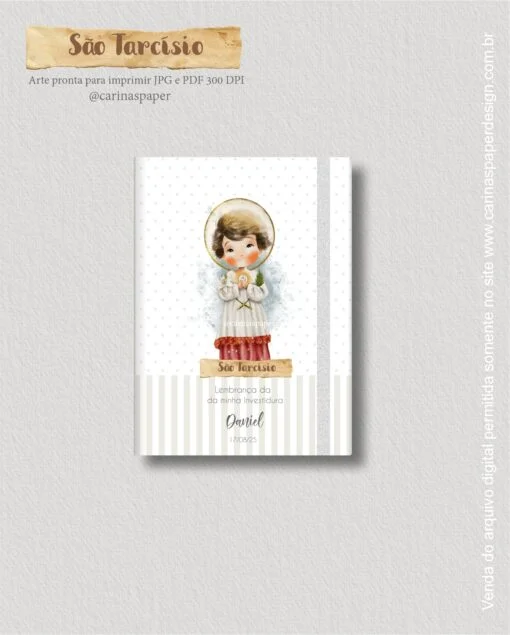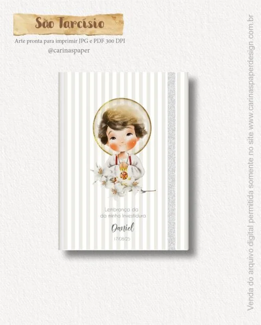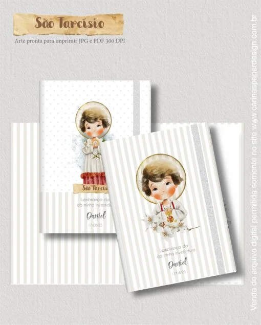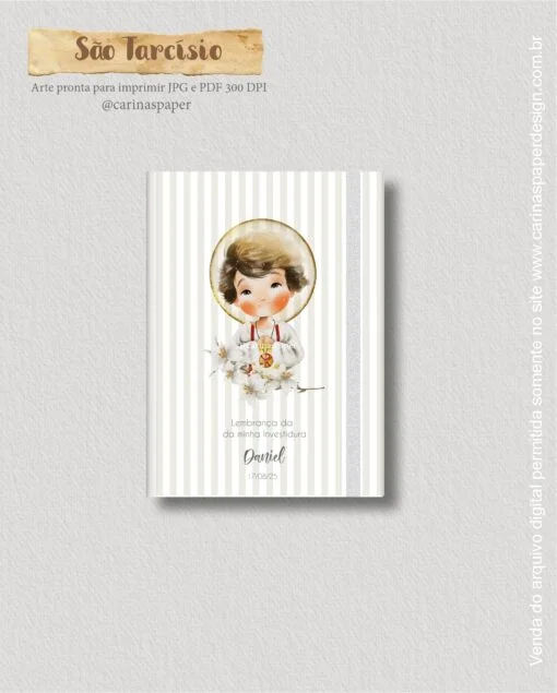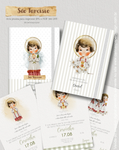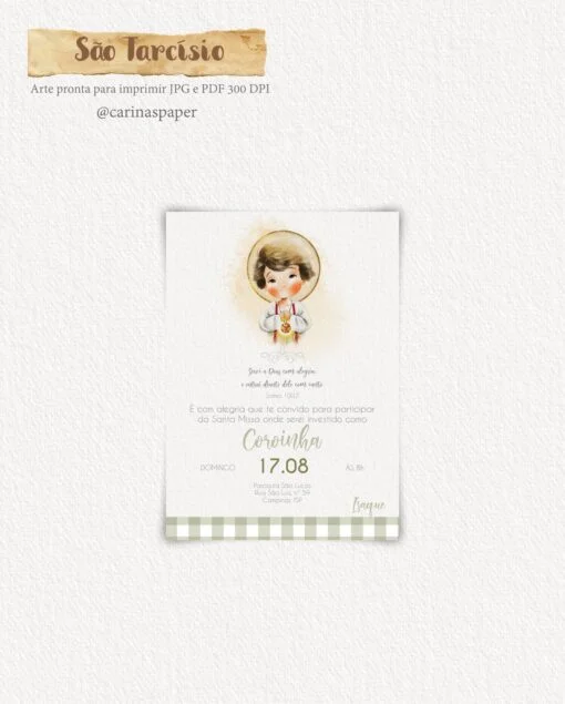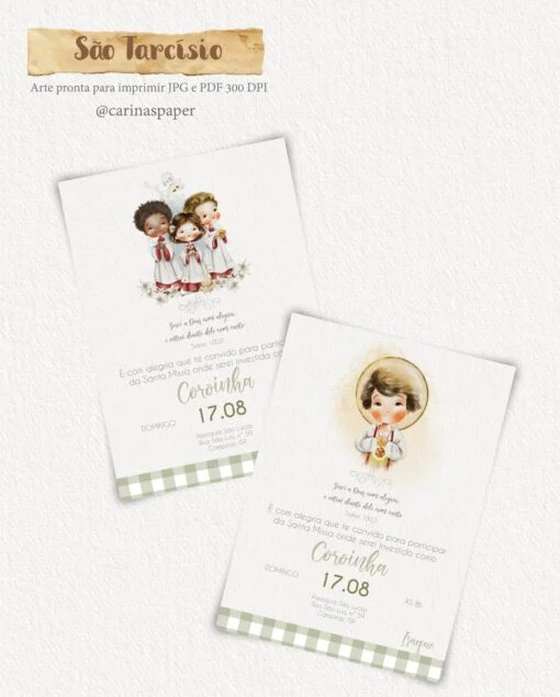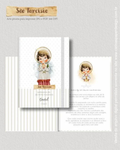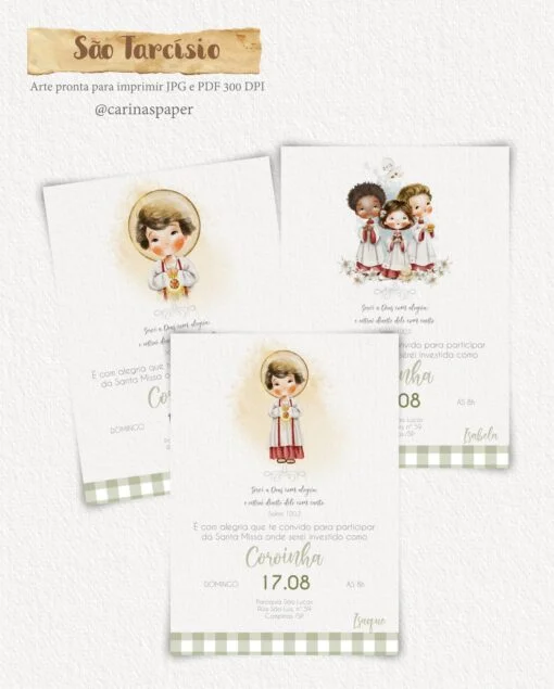 3 artes para convites para Invistidura de coroinhas A6 (14,8×10,5 cm) com ilustrações de São Tarcísio em JPG pronto para preencher com informações do coroinha e imprimir