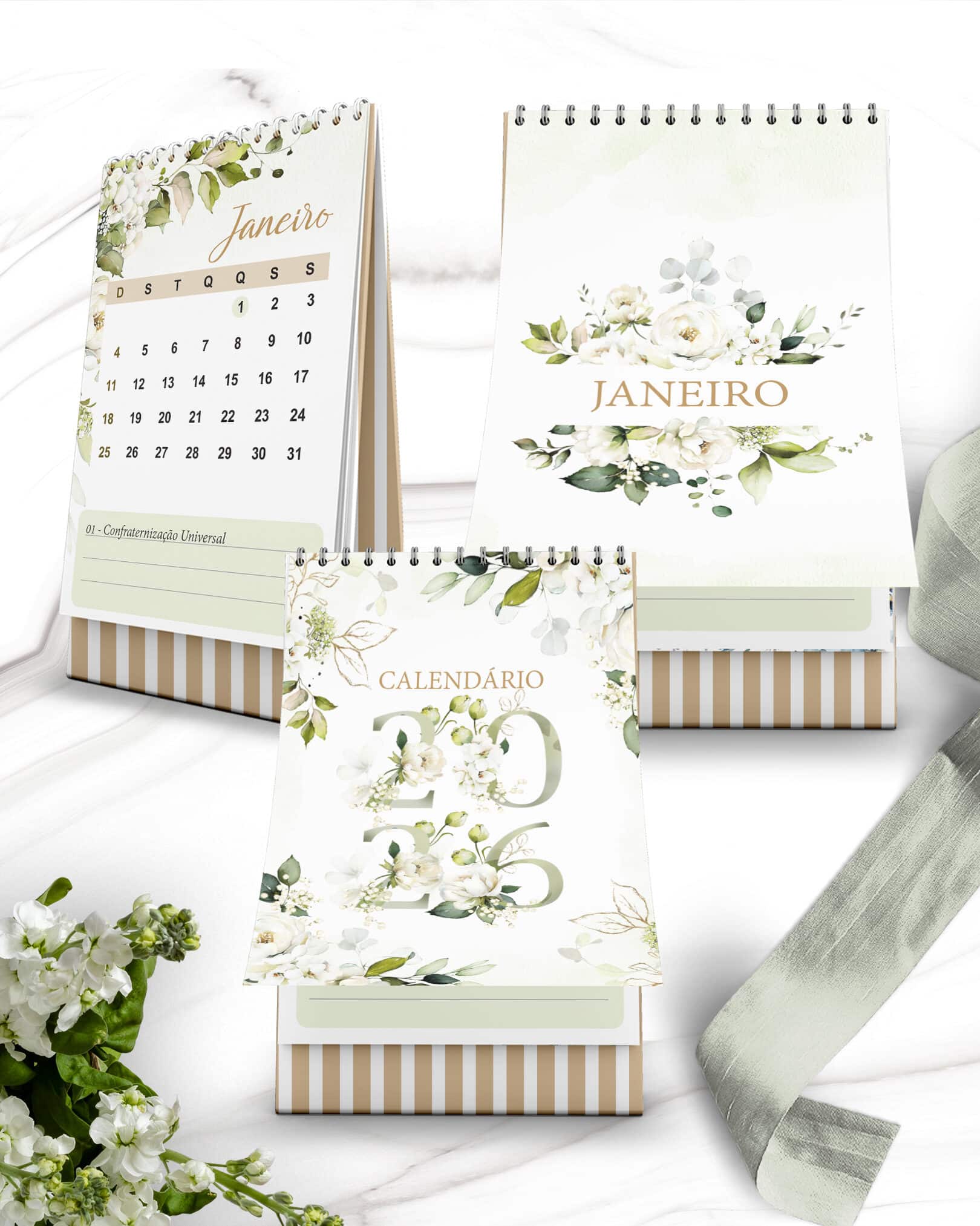 Arquivo Kit Calendários de Mesa 2026 A5 A6 e Calendário Marca Página Coleção Rosas Brancas