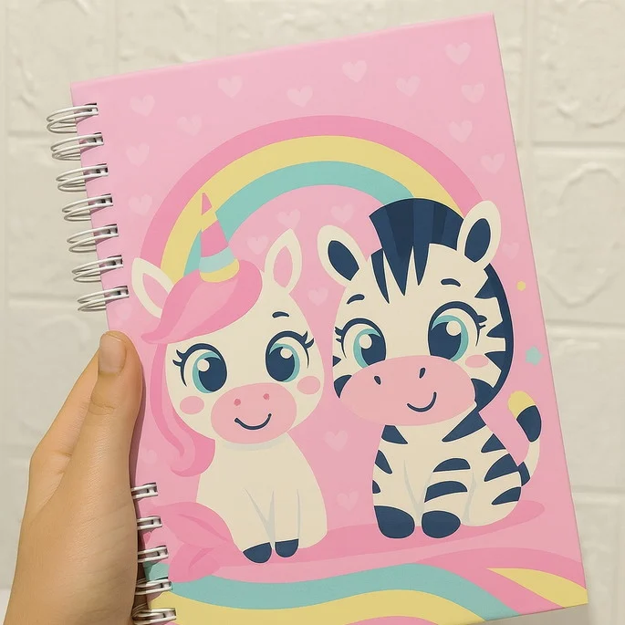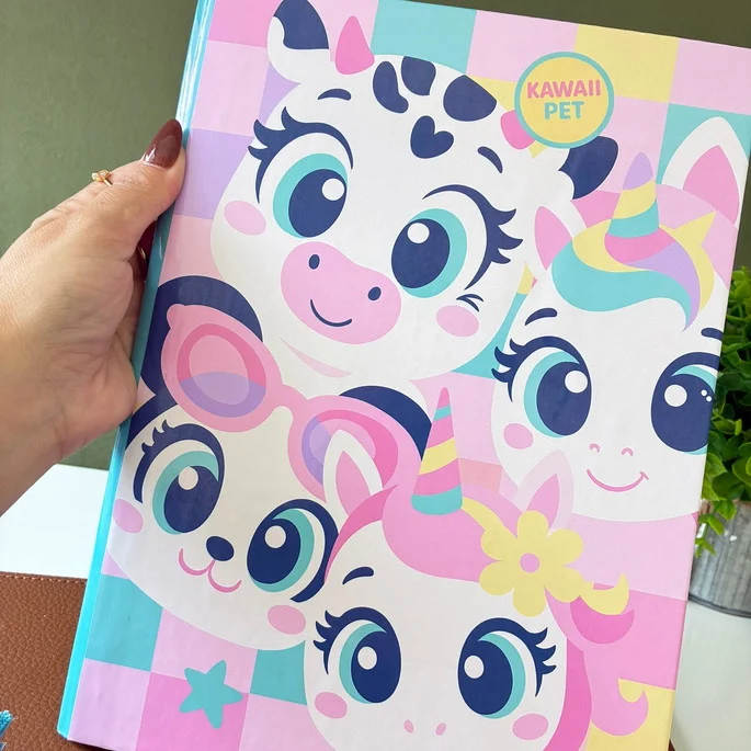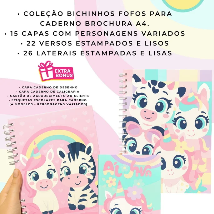 15 Capas Kawaii: Uma seleção de 15 capas exclusivas, cada uma com personagens adoráveis e diferentes, para deixar seus cadernos com aquele toque de fofura. Após a compra você irá receber dois brindes são as capas nos temas pandinha e também vaquinha um dos mais procurados para o ano de 2026