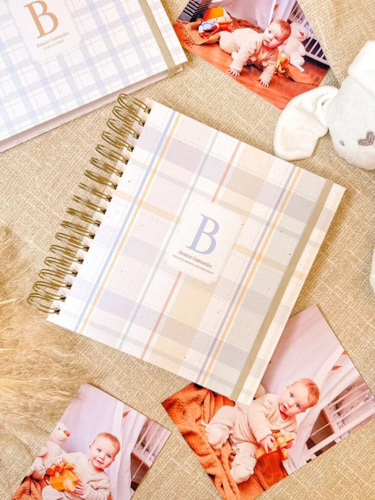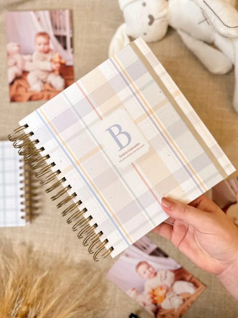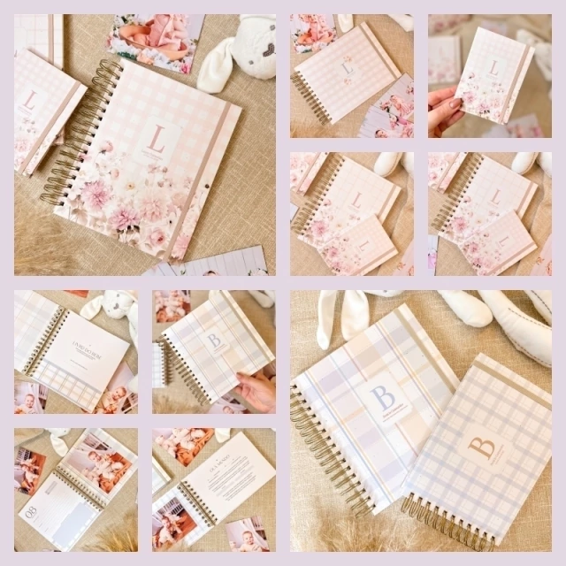 Os livros também serão enviados com versões de páginas para fotos decoradas com listras, xadrez e quadriculado nas cores neutras, pra uso com qualquer tema.