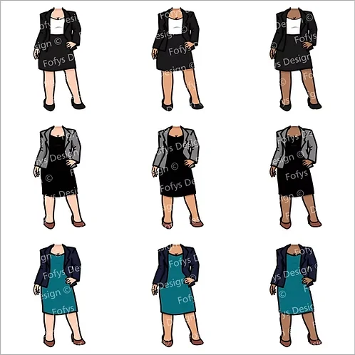 – 48 clipart femininos  magrinha e gordinha em 2 posição (em pé de frente), usando terninho em cores variadas.