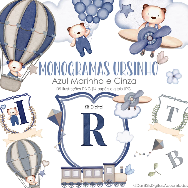 KIT DIGITAL MONOGRAMA URSINHO AZUL MARINHO E CINZA
